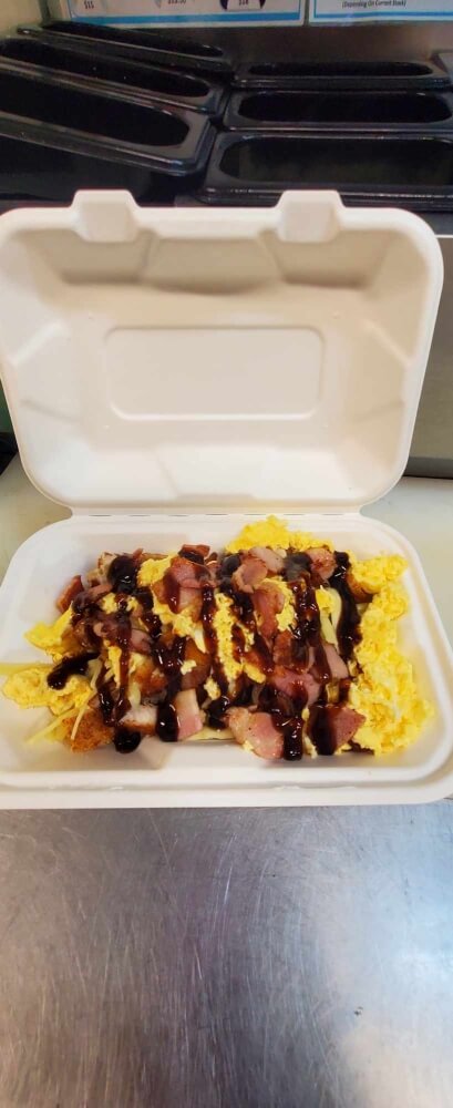 Egg, bacon, onion, tasty cheese and bbq sauce