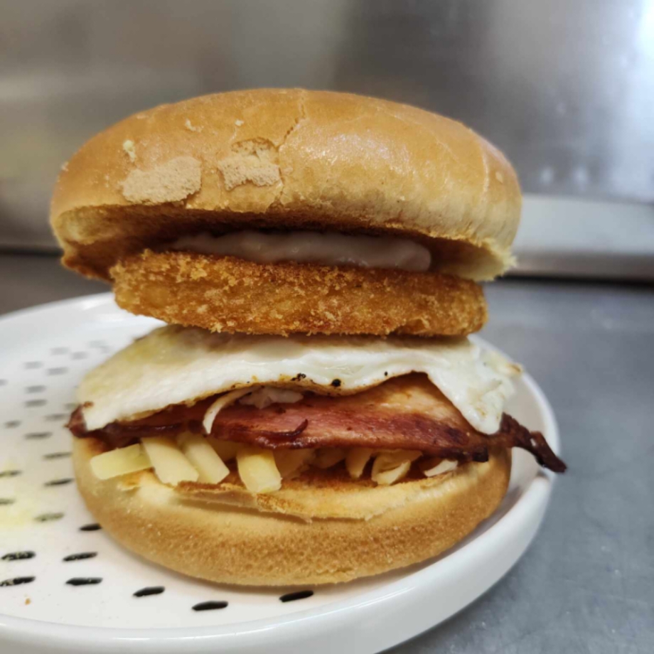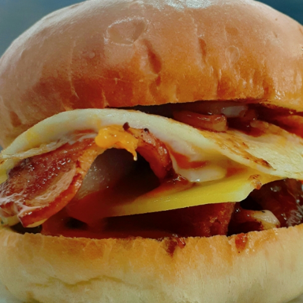 Bacon, egg, tasty cheese, fried tomato, cooked onion, hash brown and bbq sauce on a toasty hot bun, a hangovers best friend!!