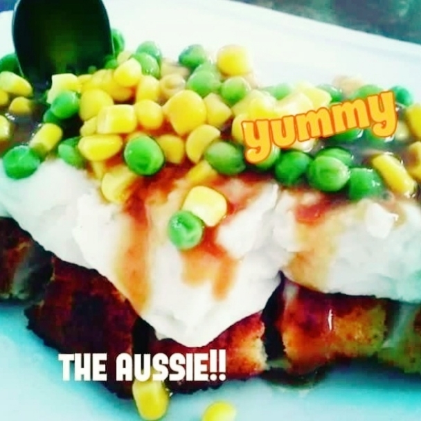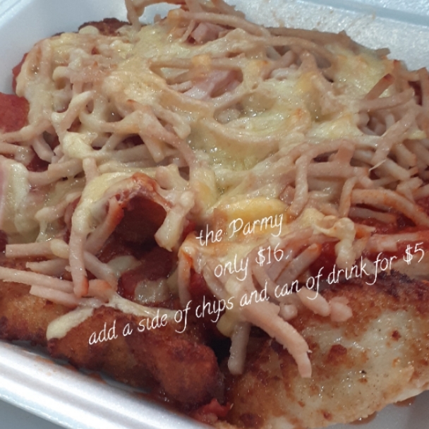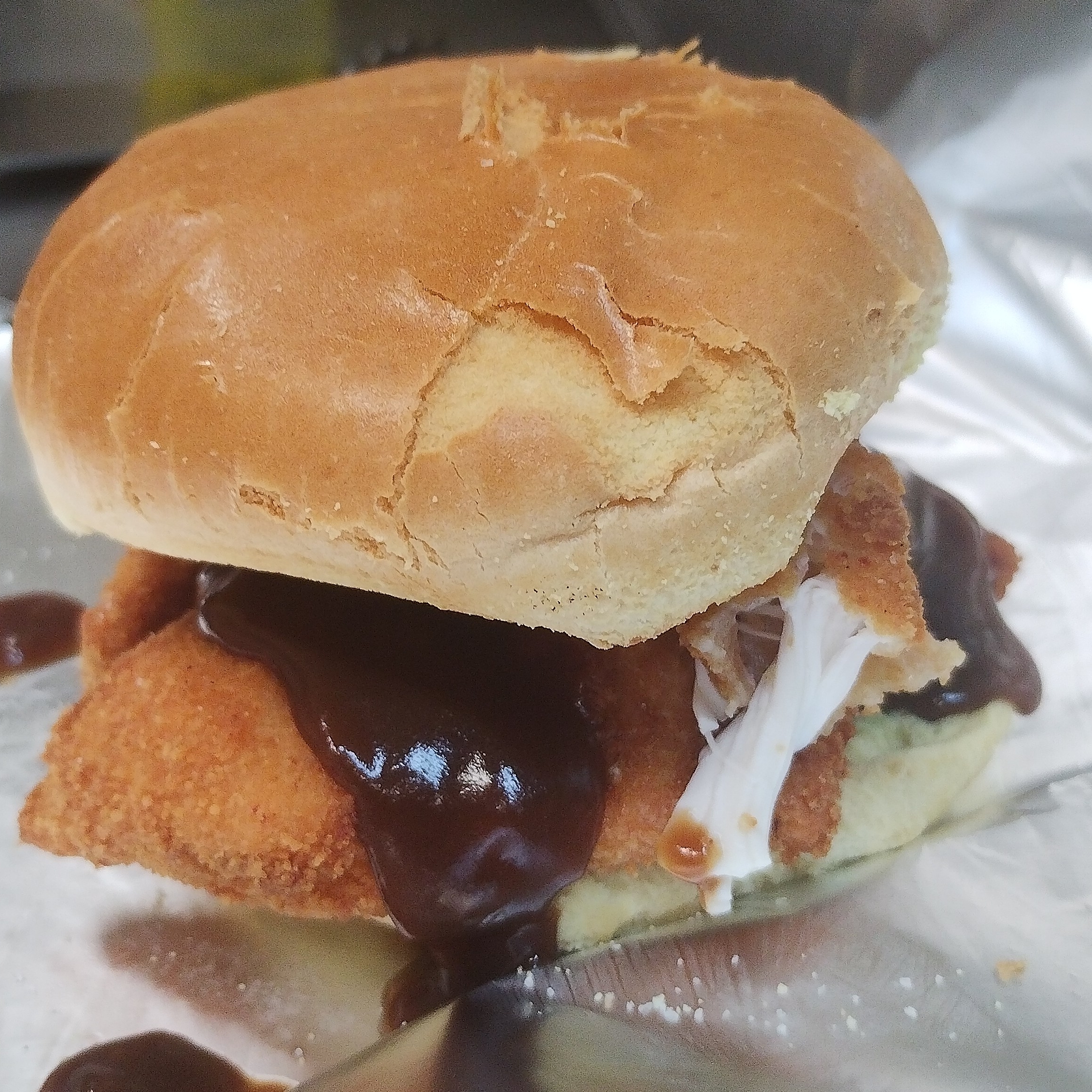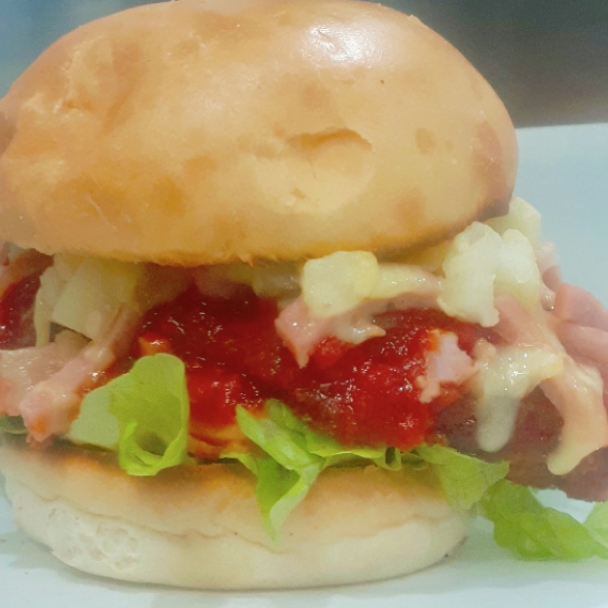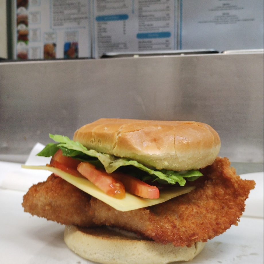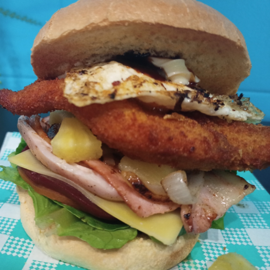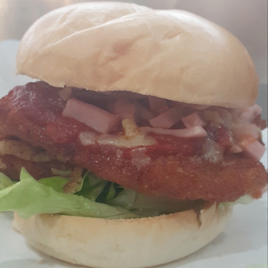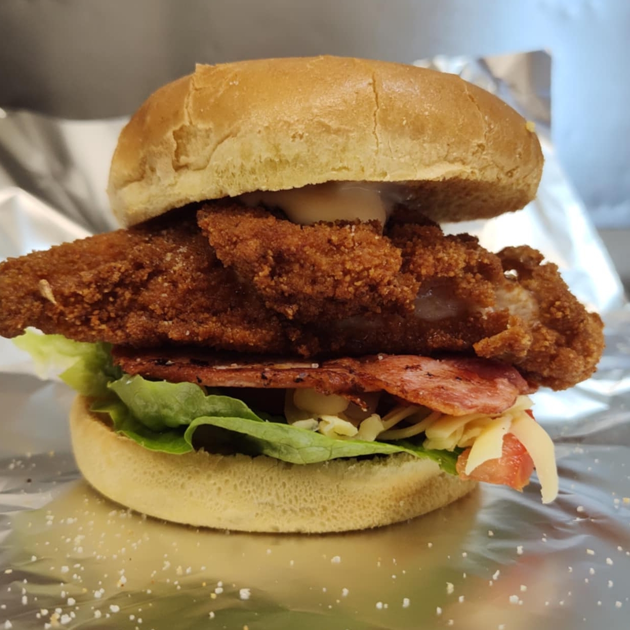Chicken snitty, lettuce, tomato, bacon, cheese, egg, onion, beetroot, pineapple, mayo, bbq sauce on a toasty bun.