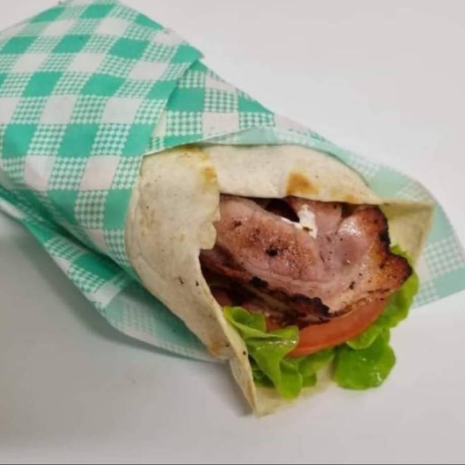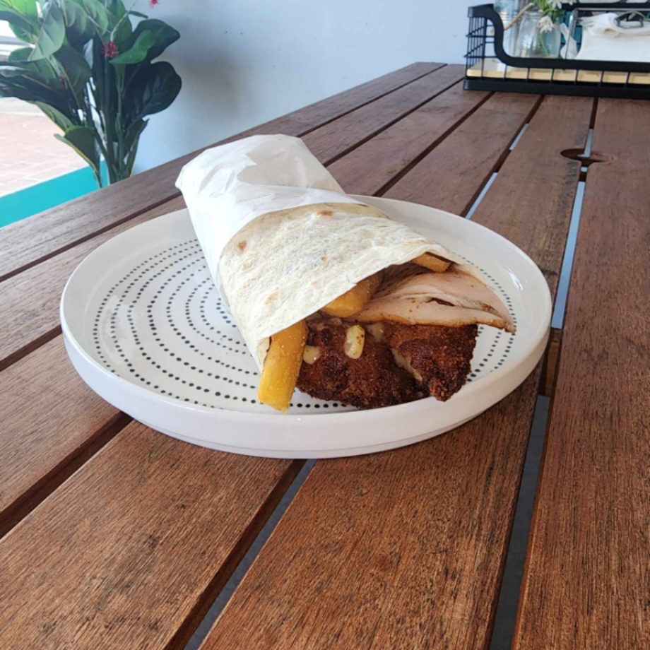 Chicken Snitty, bacon, cheese, hot chips, bbq sauce and garlic aoili on a wrap