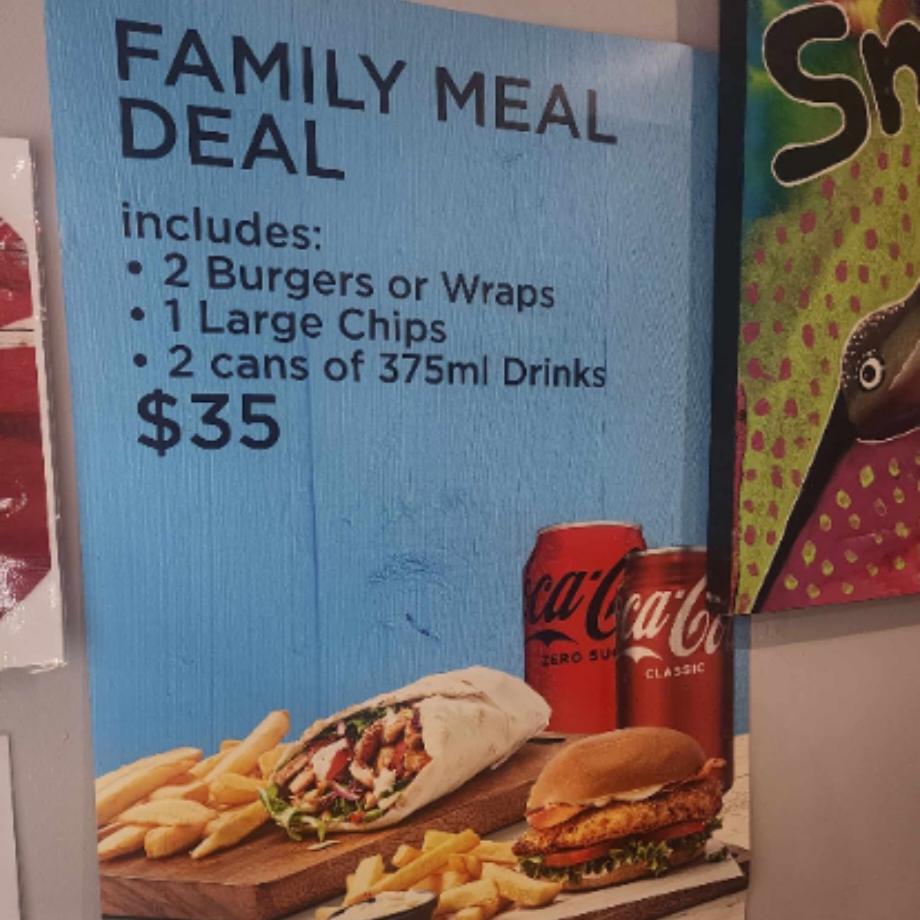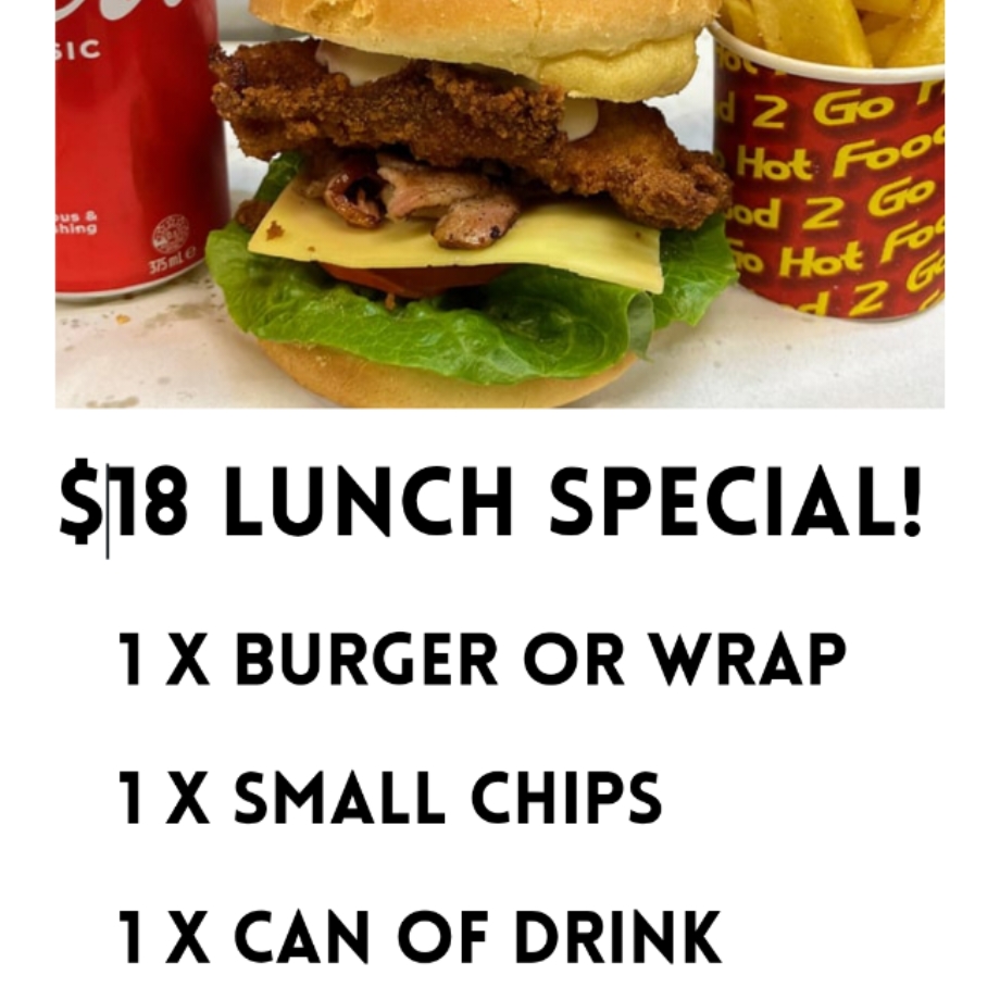 2 chicken Snitty burgers/or wraps, large chips 2 cans of drink