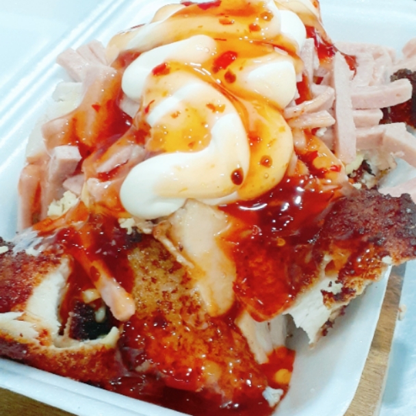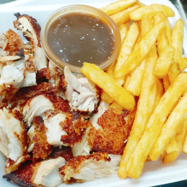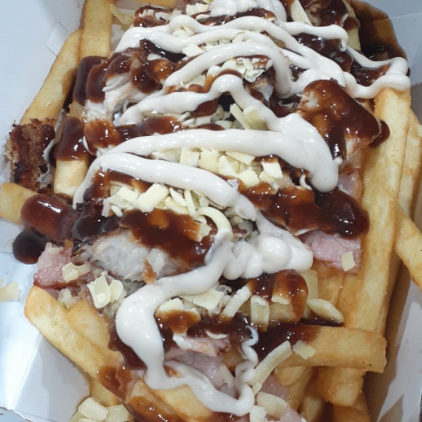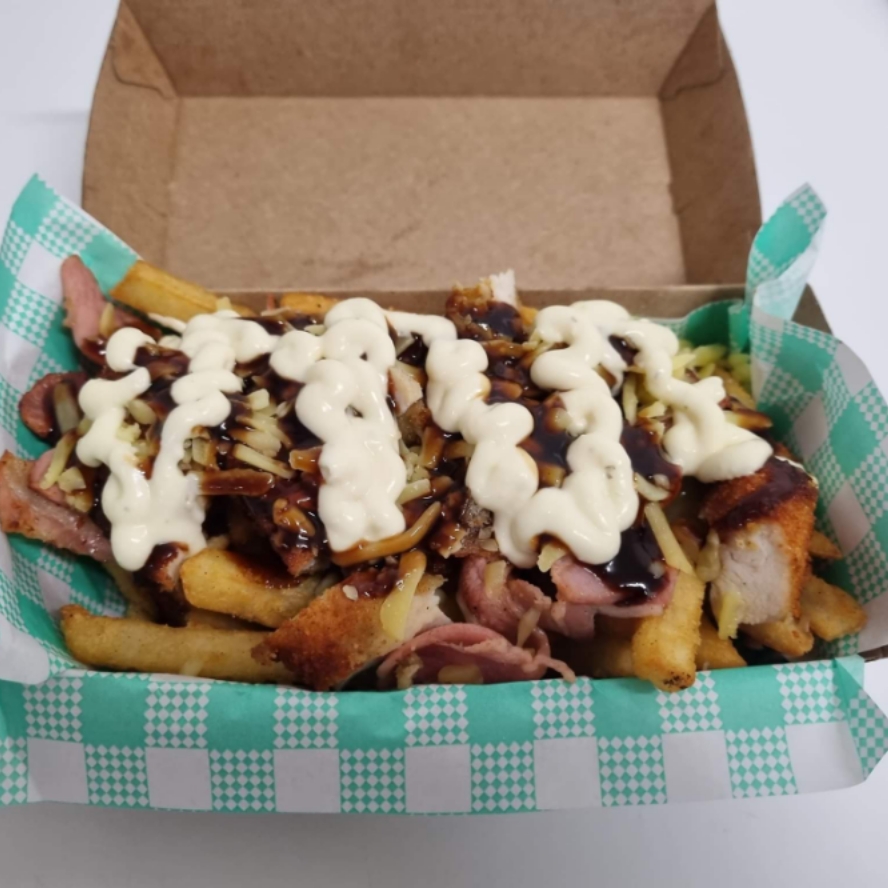 Small serve of hot n fresh chippies, loaded with chicken snitty, bacon, cheese, bbq sauce and aoili.
