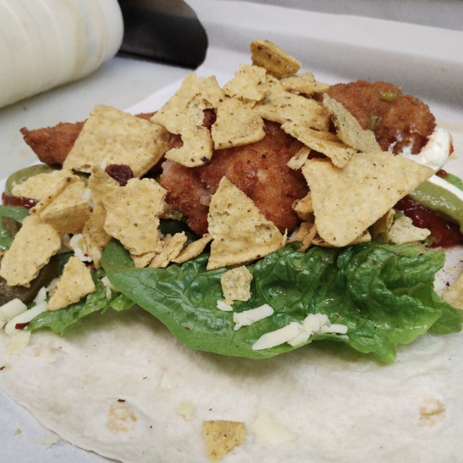Chicken snitty, scrambled egg, bacon, cheese, bbq sauce on a toasty wrap