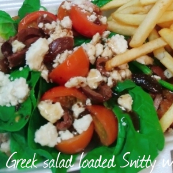 Snitty, lettuce, baby spinach, cherry tomatoes, Kalamata olives, fetta and balsamic dressing
