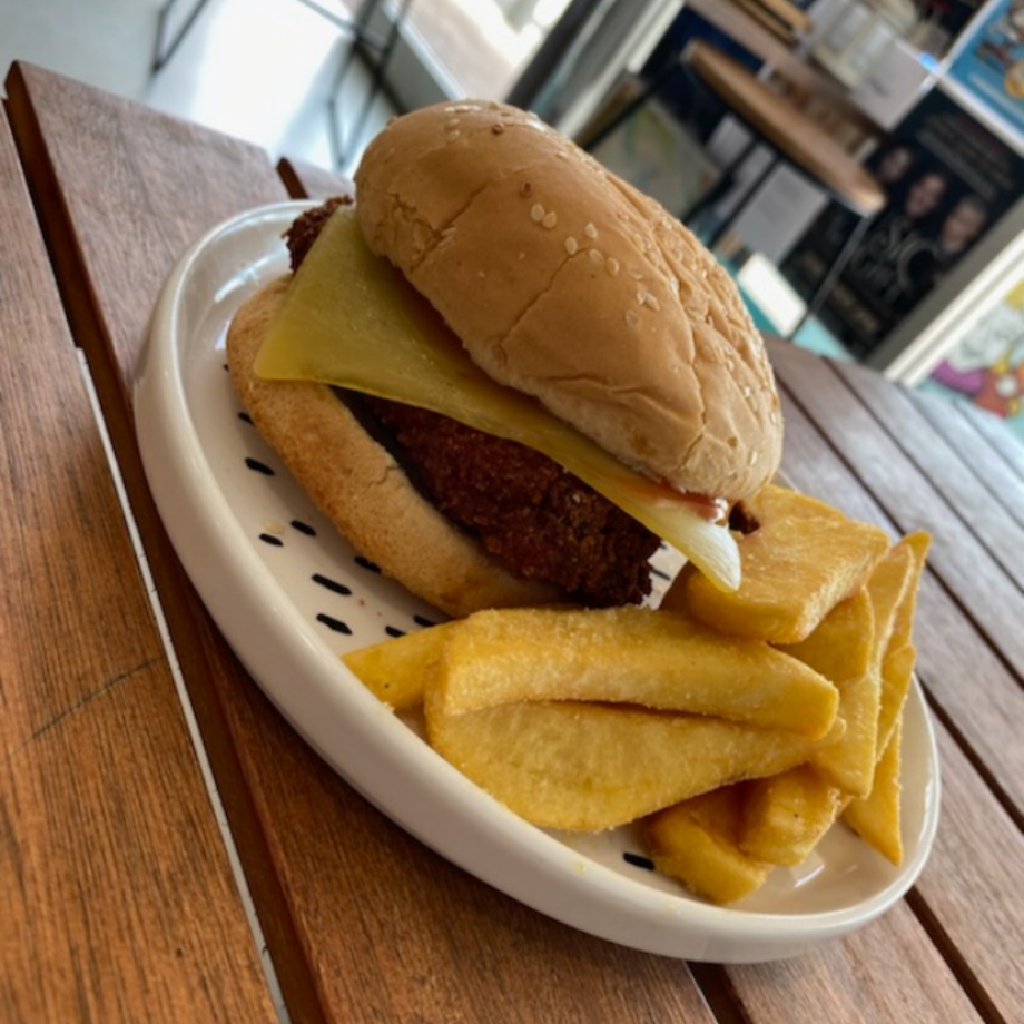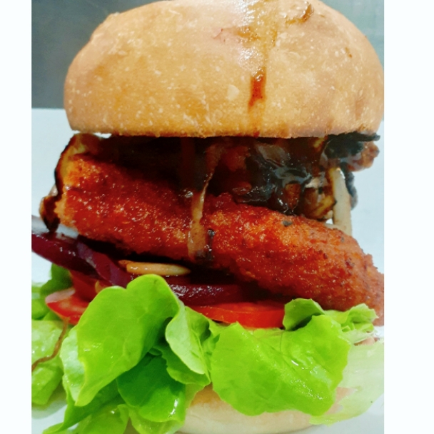 Crumbed steak, bbq sauce, cooked onion, tomato and lettuce