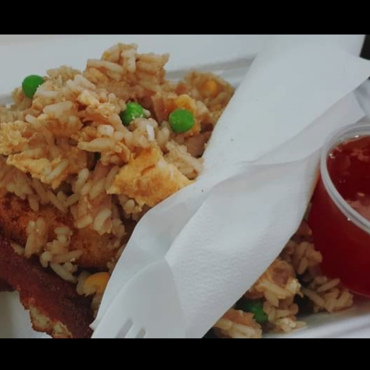 sliced chicken snit covered in our house fried rice! & a side of sweet chilli sauce. yum