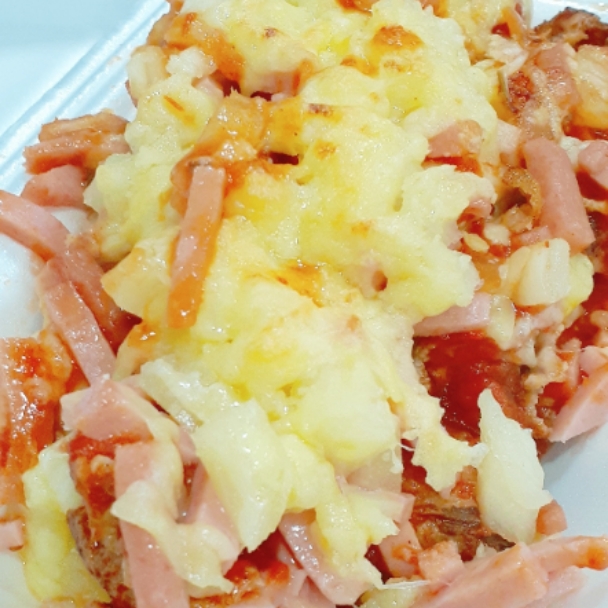 Snitty, nap sauce, shredded ham, pineapple, melted cheese and lettuce