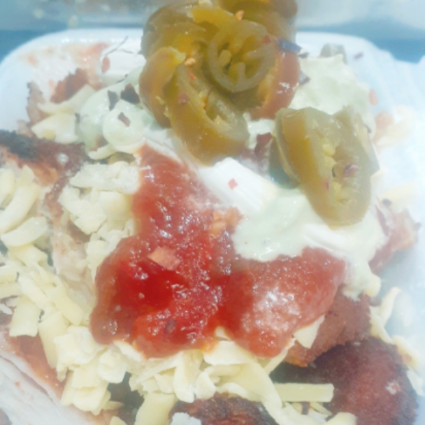 Snitty, lettuce, cheese, salsa, gaucamole, sour cream, jalapeno peppers and chilli flakes